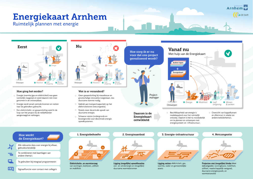 CE Delft ondersteunt gemeenten, provincies en regio’s bij het praktisch toepassen van energieplanologie. Zo waren wij betrokken bij het Leer- en kennisprogramma Energieplanologie, waarin overheden en netbeheerders samen leren hoe zij energie en ruimte beter integraal kunnen plannen. Daarnaast ontwikkelden wij de Energiekaart Arnhem: een concreet instrument dat inzicht geeft in het lokale energiesysteem en helpt bij ruimtelijke en beleidsmatige afwegingen.